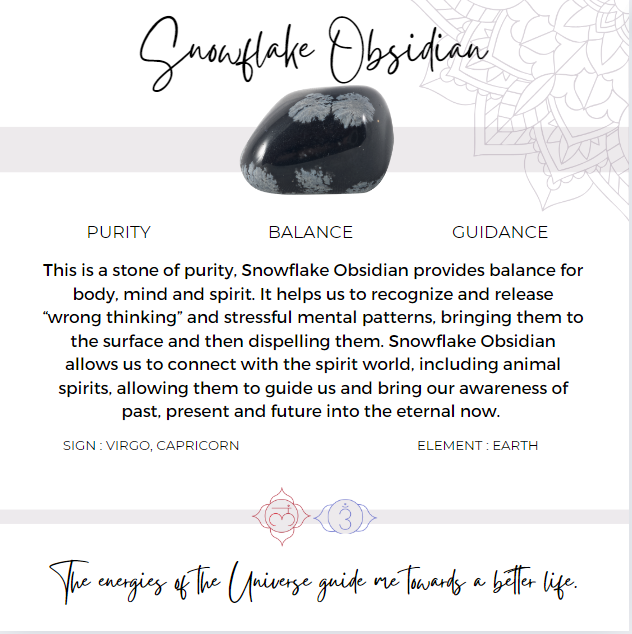 This is a stone of purity, Snowflake Obsidian provides balance for body, mind and spirit. It helps us to recognize and release “wrong thinking” and stressful mental patterns, bringing them to the surface and then dispelling them. Snowflake Obsidian allows us to connect with the spirit world, including animal spirits, allowing them to guide us and bring our awareness of past, present and future into the eternal now.